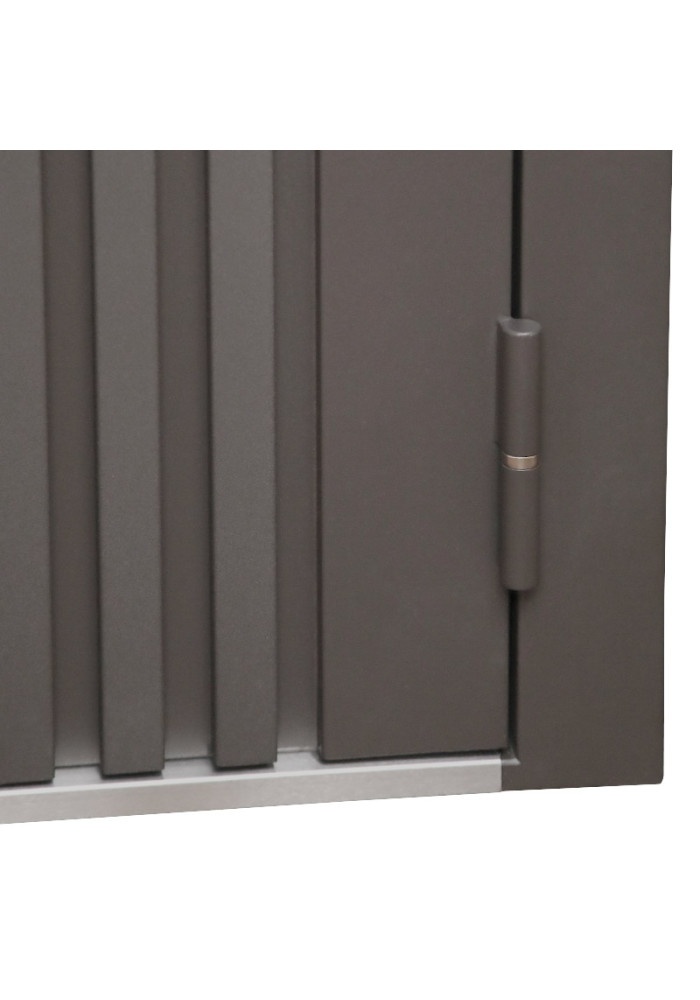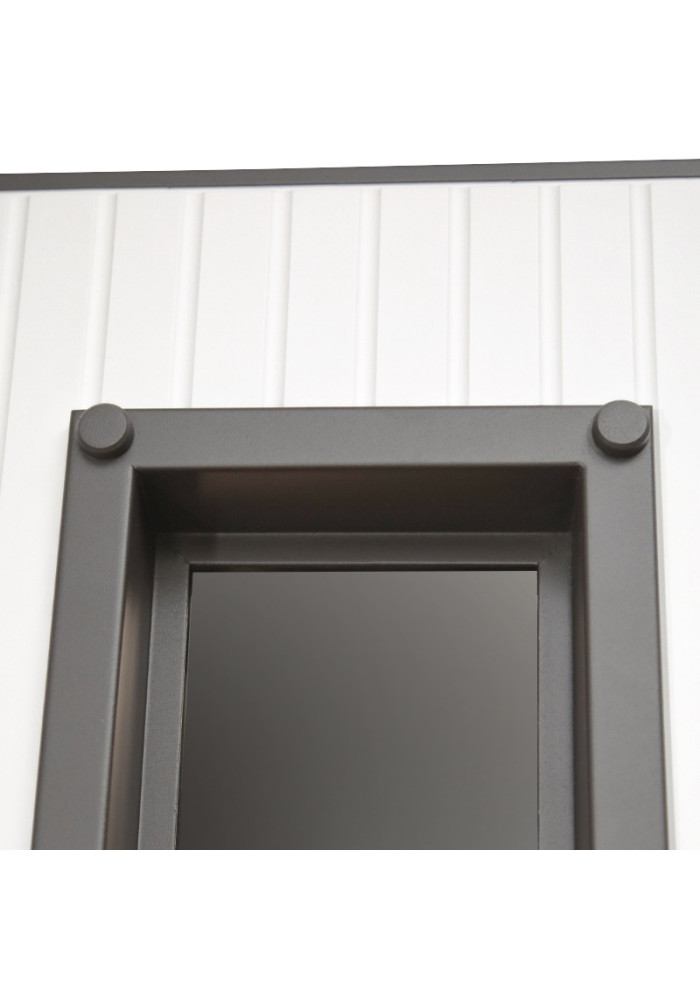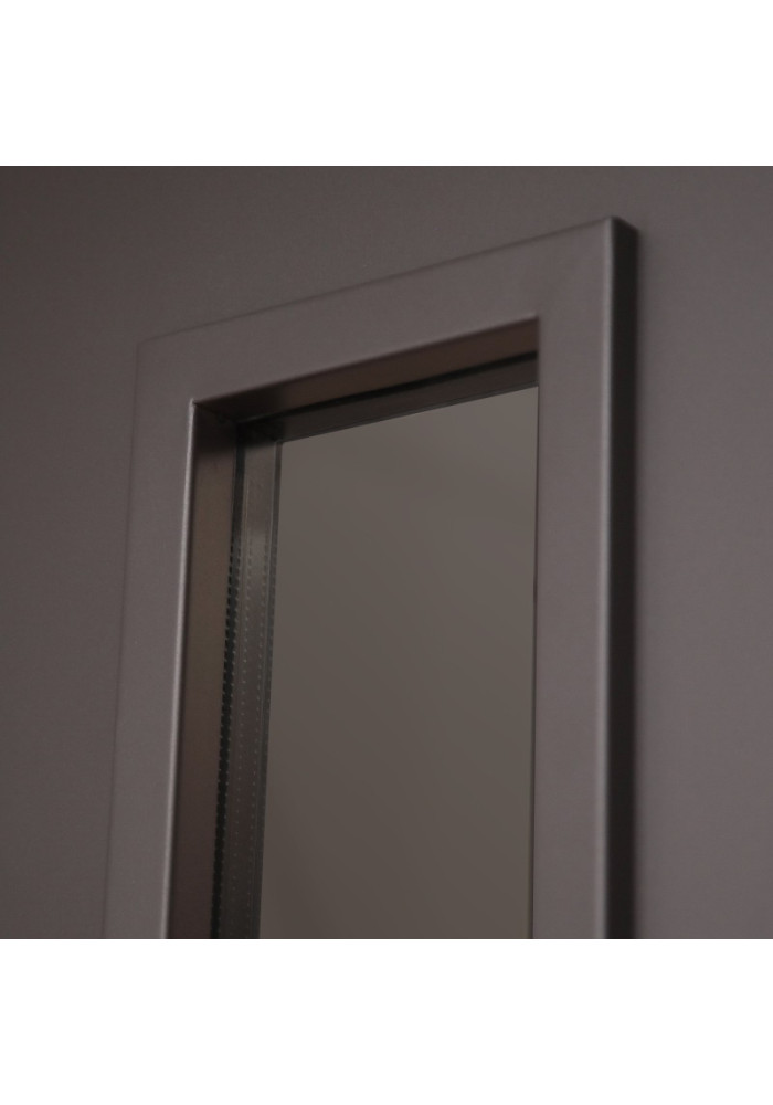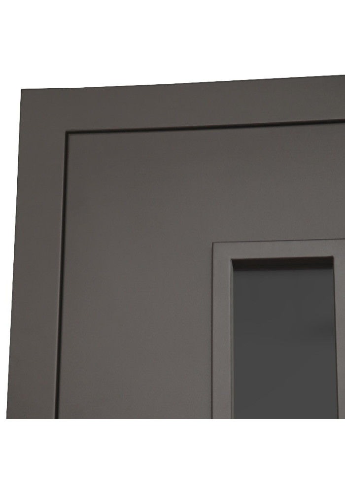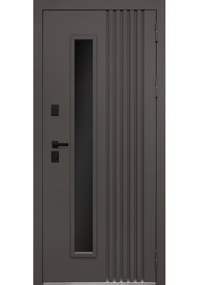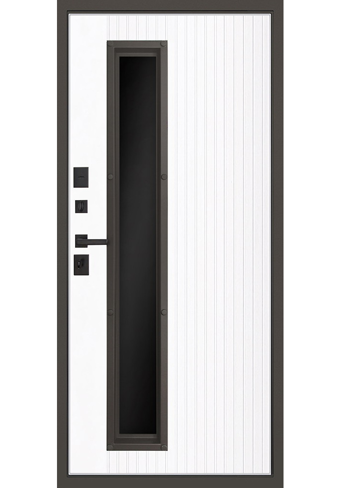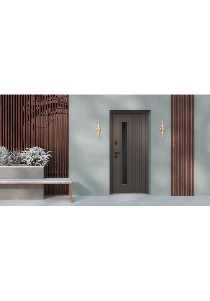 - Наружный лист металла: Лист металла 1,8 мм. Вертикальные рейки из металла. Два слоя покрытия. Тонированный двухкамерный стеклопакет. Наличник гладкий.
