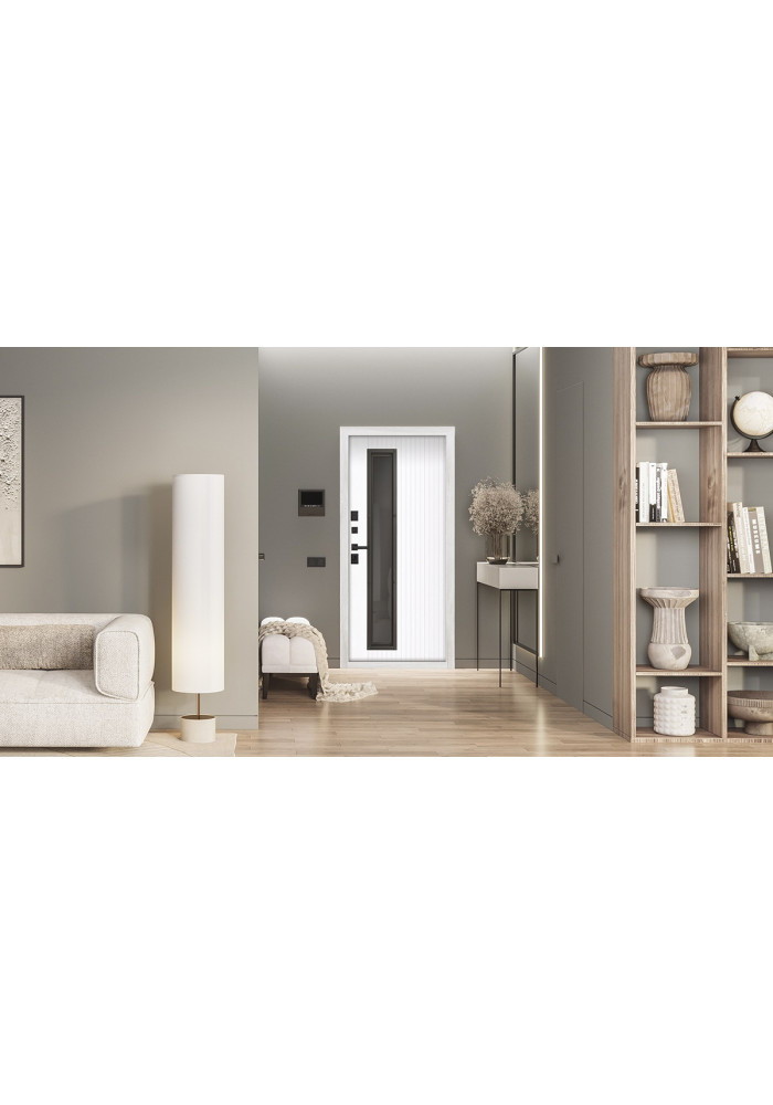 - Внутренняя отделка: Панель МДФ 16 мм. Цвет «белый матовый». Объемная фрезеровка. Прижимная рамка 30мм (покраска в цвет двери). Стеклопакет тонированный.